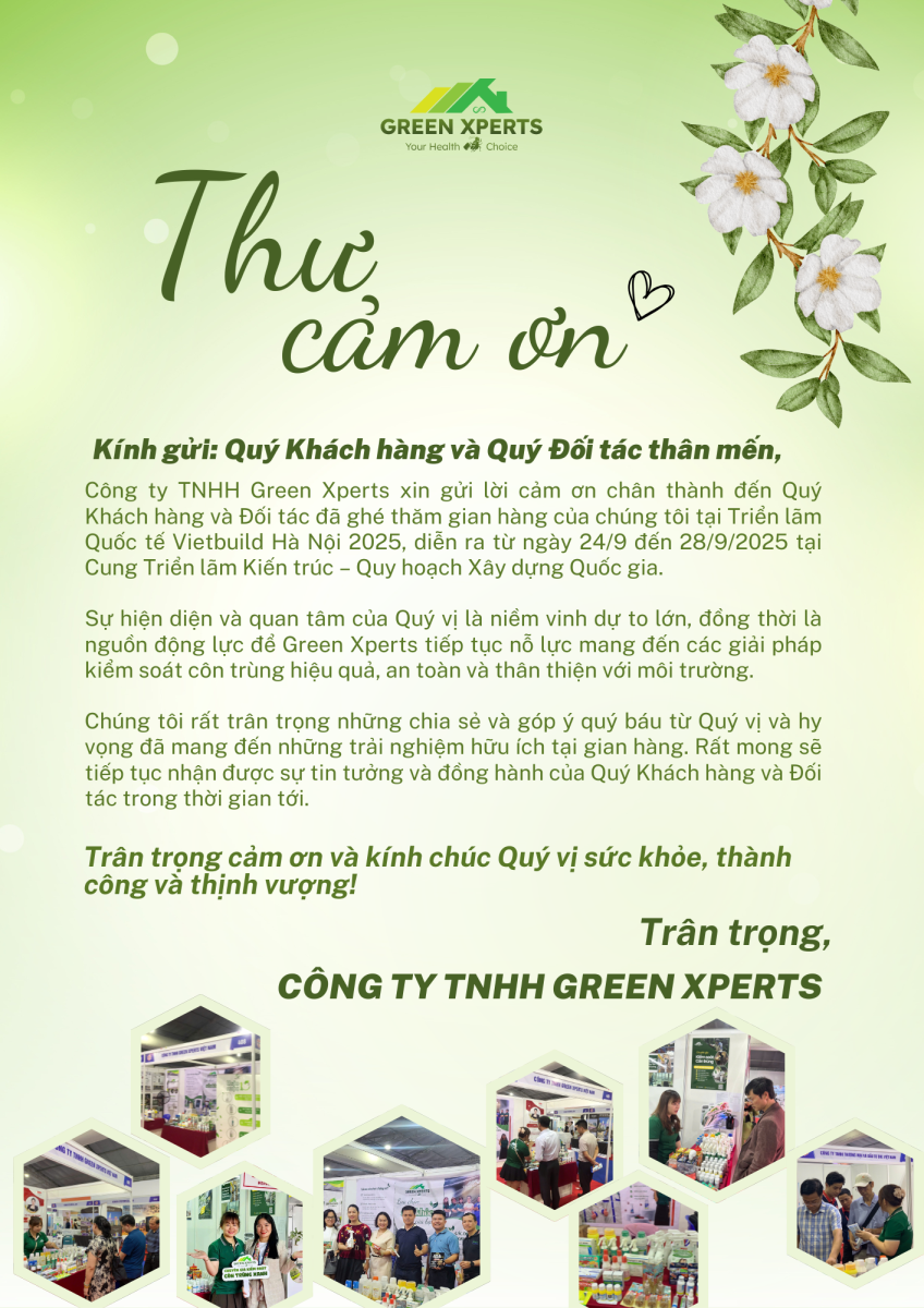 Công ty TNHH Green Xperts xin gửi lời cảm ơn chân thành và sâu sắc nhất đến Quý Khách hàng và Quý Đối tác đã dành thời gian ghé thăm và đồng hành cùng chúng tôi tại Triển lãm Quốc tế Vietbuild Hà Nội 2025, diễn ra từ ngày 24/9 đến 28/9/2025 tại Cung Triển lãm Kiến trúc – Quy hoạch Xây dựng Quốc gia, Hà Nội.